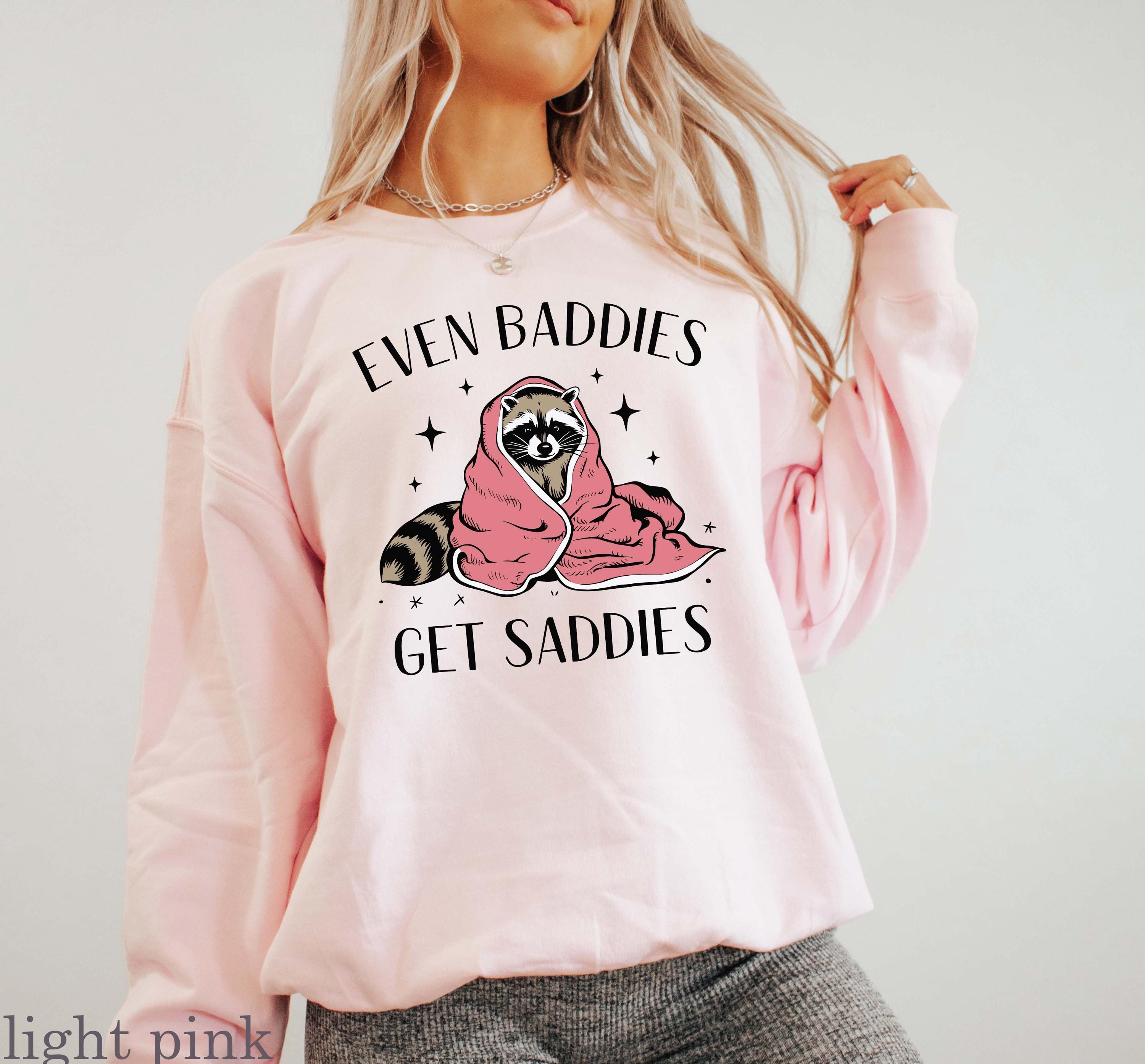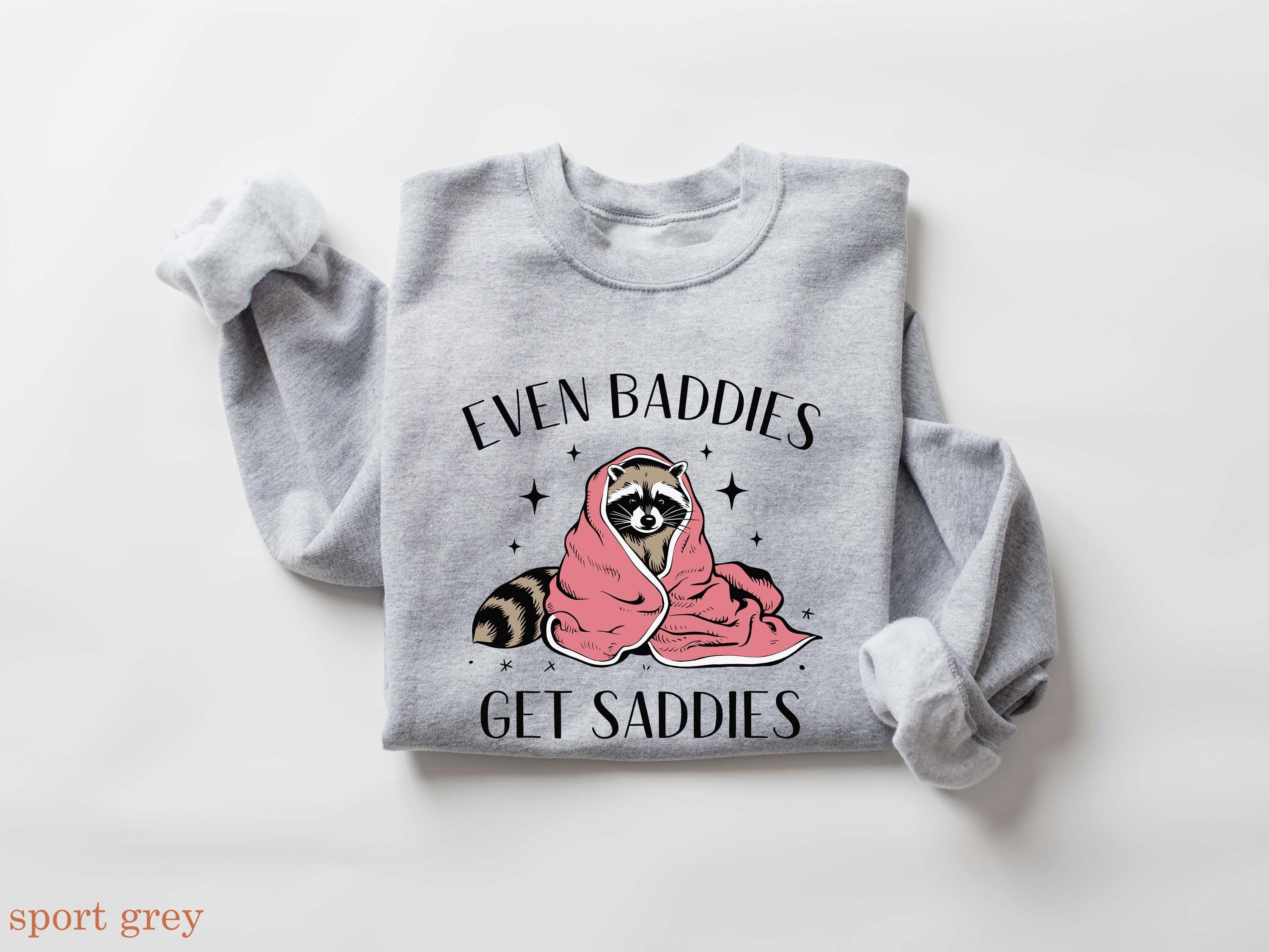 A cute raccoon sweatshirt featuring a funny meme design. Unisex sizing. Machine wash cold, inside out. Made-to-order; no returns unless damaged or defective. Colors may vary slightly.