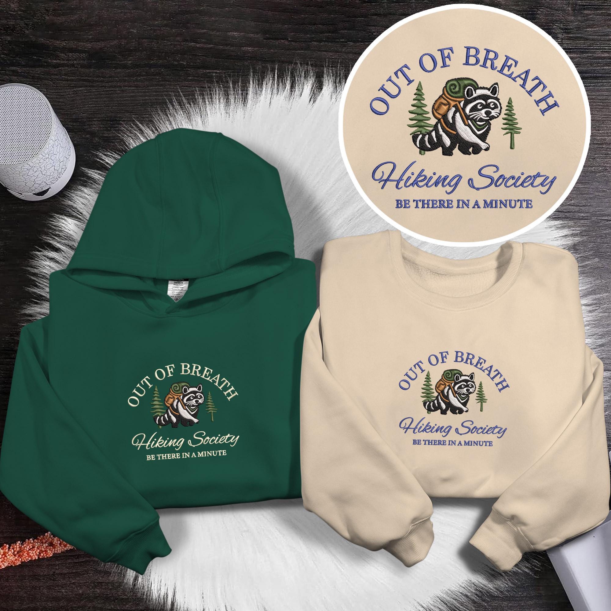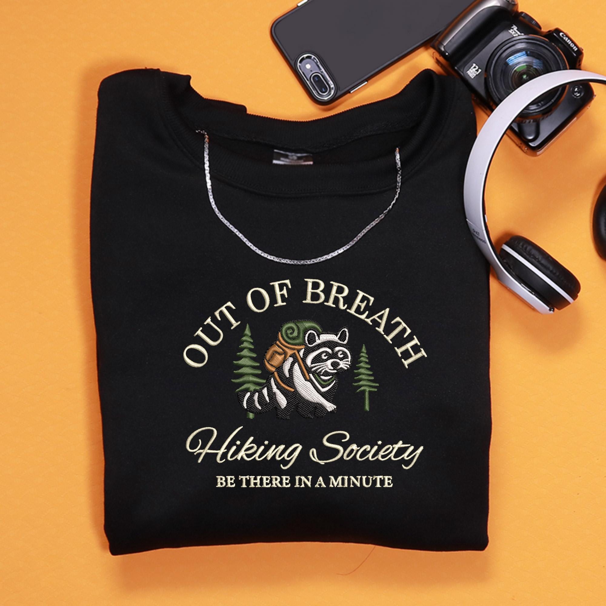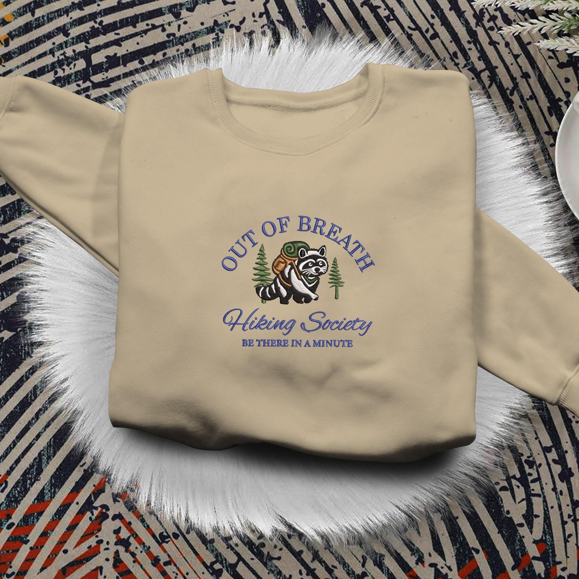 Add humor to your hiking adventures with our “Out of Breath Hiking Society” embroidered sweatshirt. Featuring a charming raccoon carrying a backpack, this design is perfect for hikers, nature lovers, and anyone who enjoys the outdoors with a touch of fun.