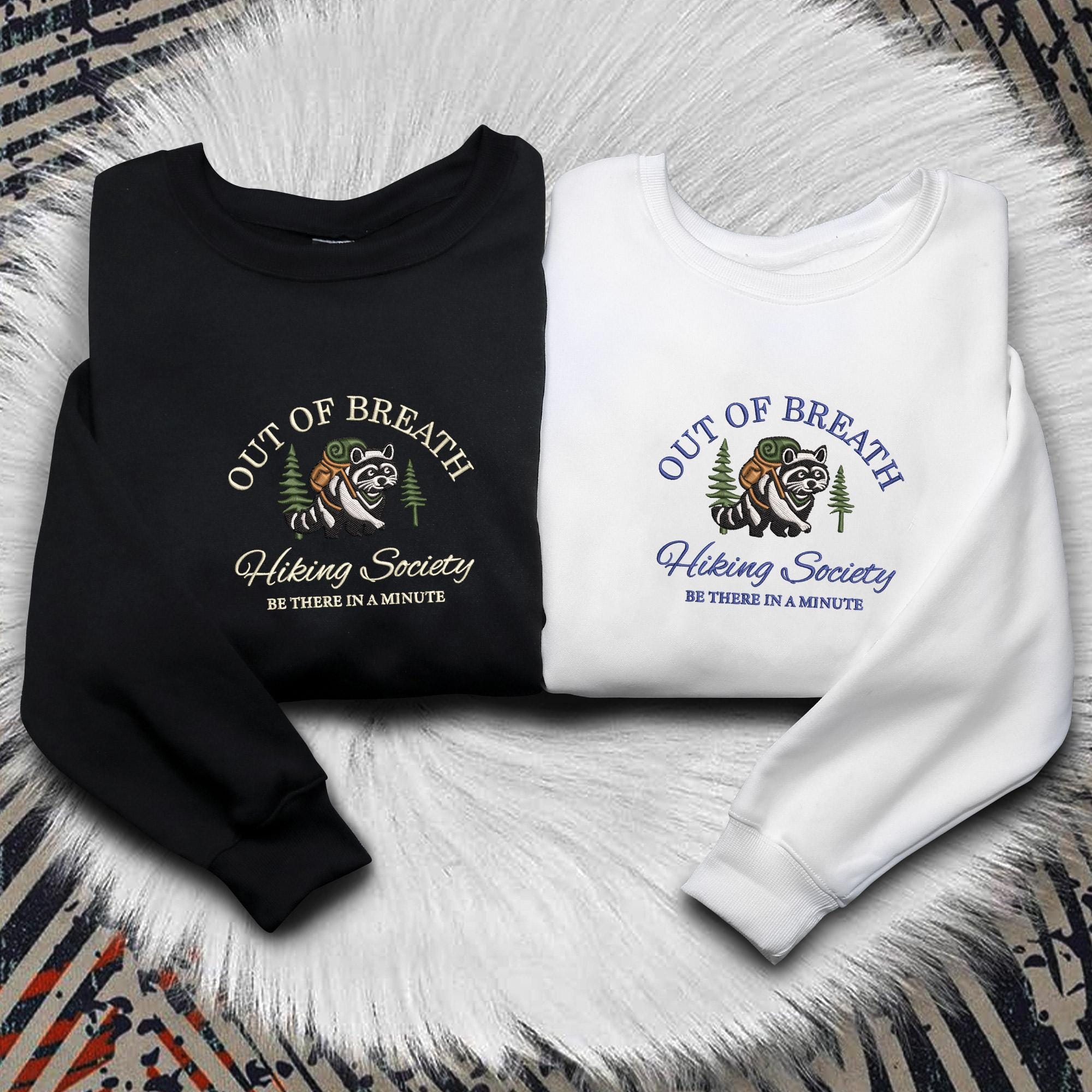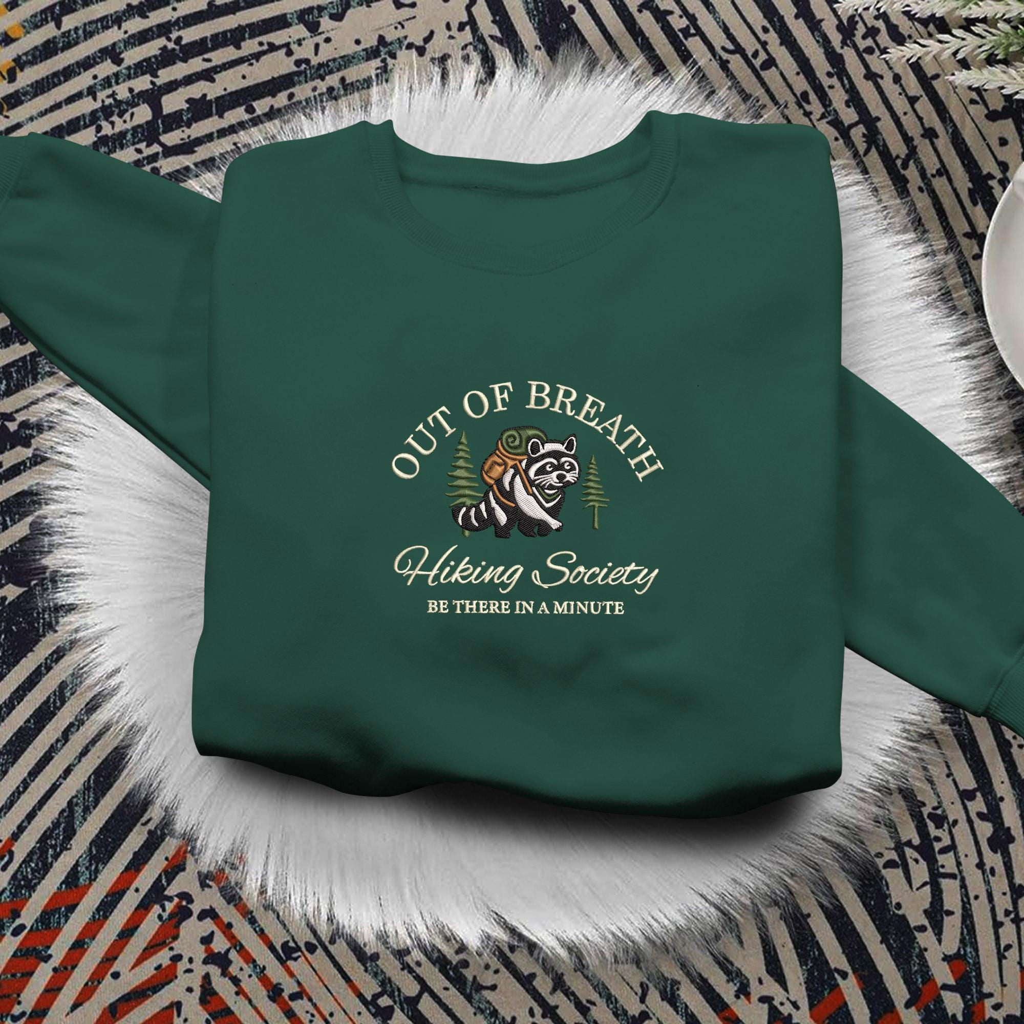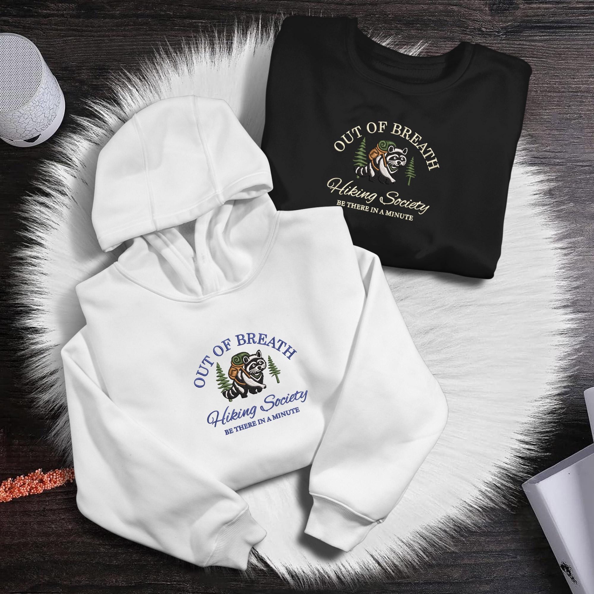 Add humor to your hiking adventures with our “Out of Breath Hiking Society” embroidered sweatshirt. Featuring a charming raccoon carrying a backpack, this design is perfect for hikers, nature lovers, and anyone who enjoys the outdoors with a touch of fun.