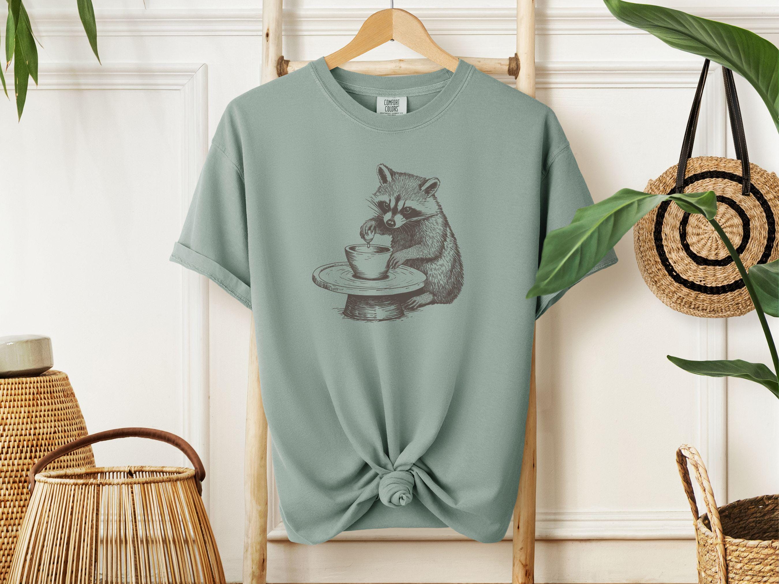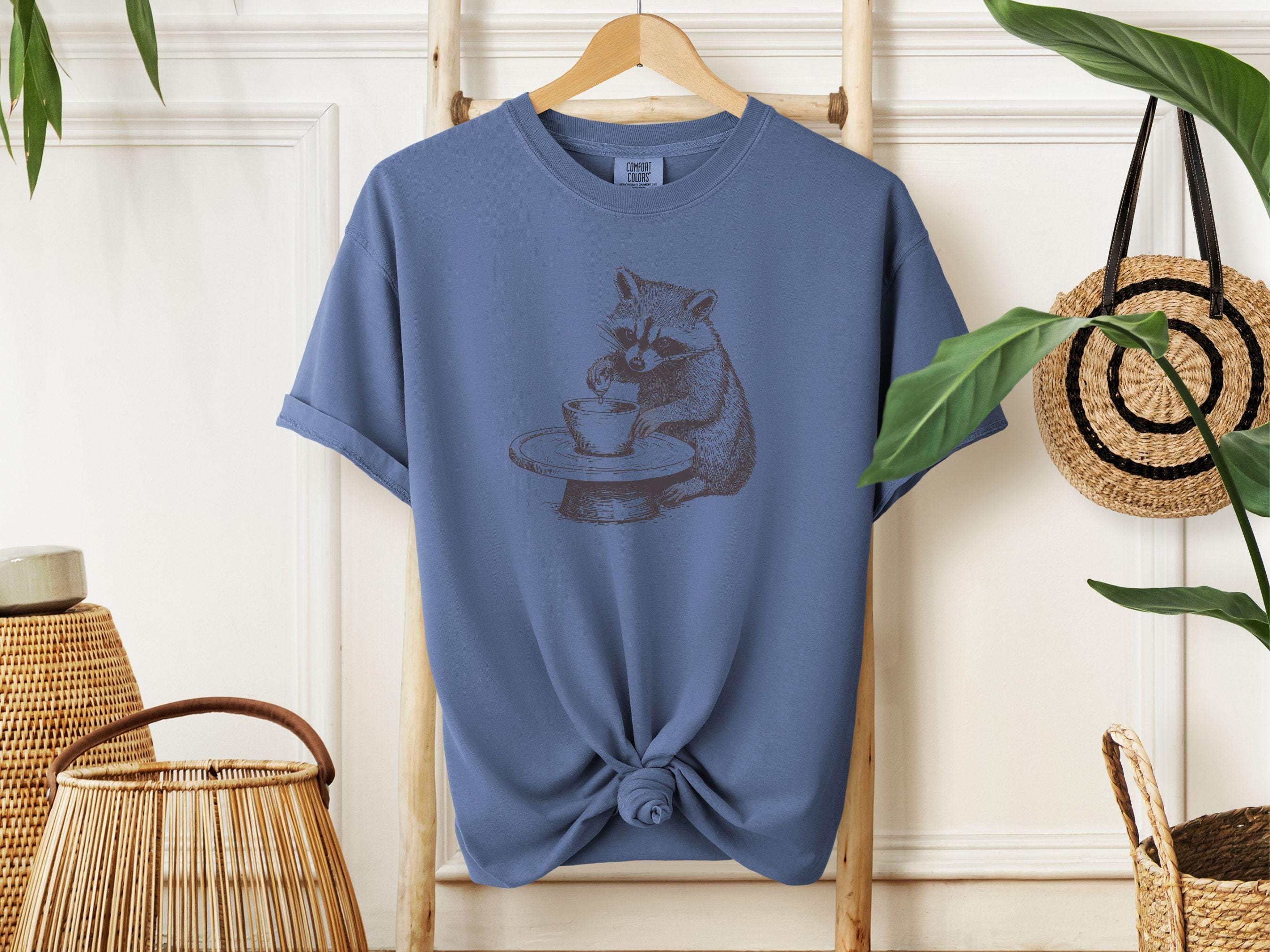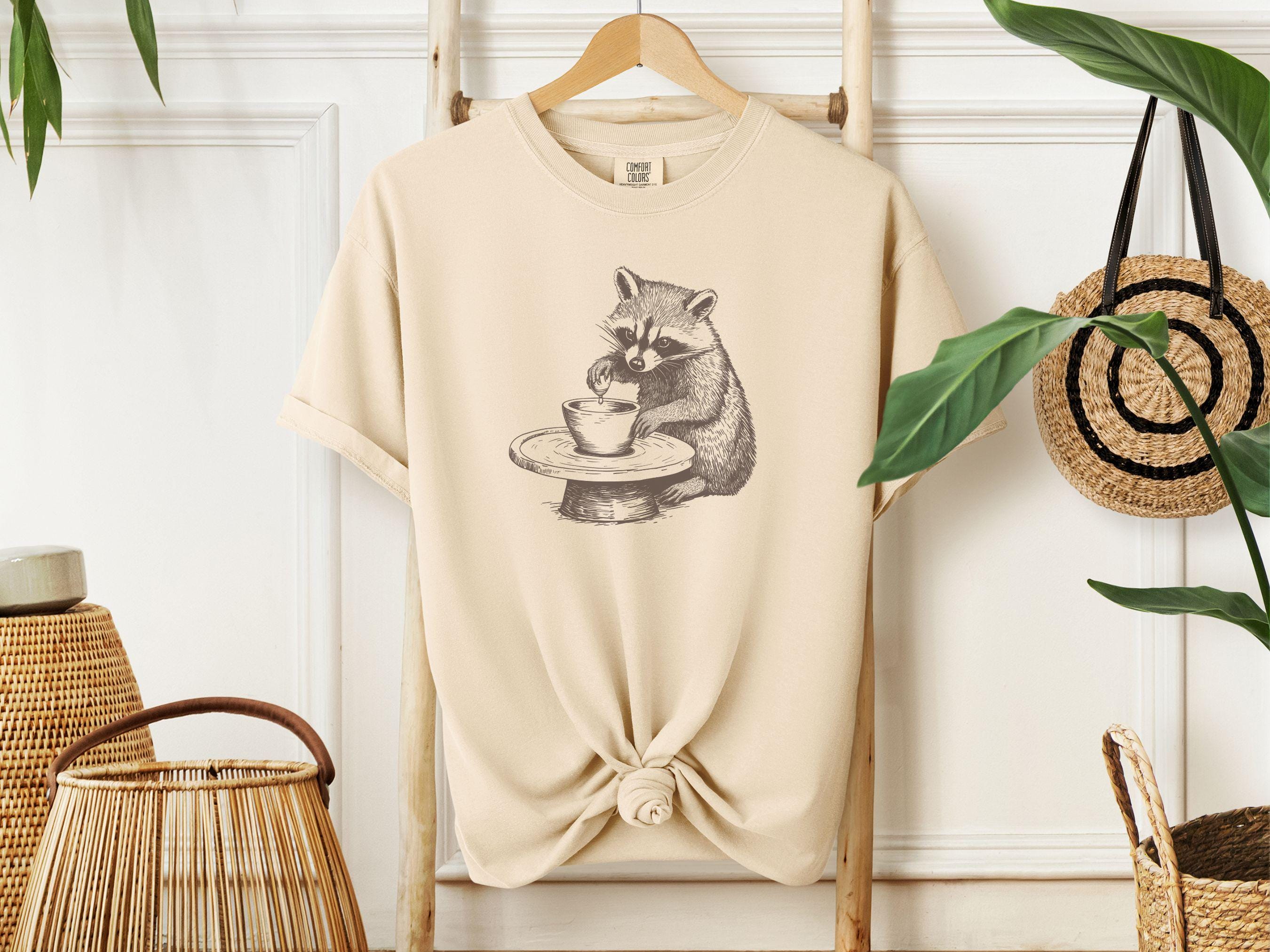 This charming t-shirt features a hand-drawn raccoon at a pottery wheel. It’s perfect for ceramic artists, pottery lovers, and anyone who appreciates whimsical designs. A relaxed fit makes it comfortable and cozy. A great gift for art enthusiasts.