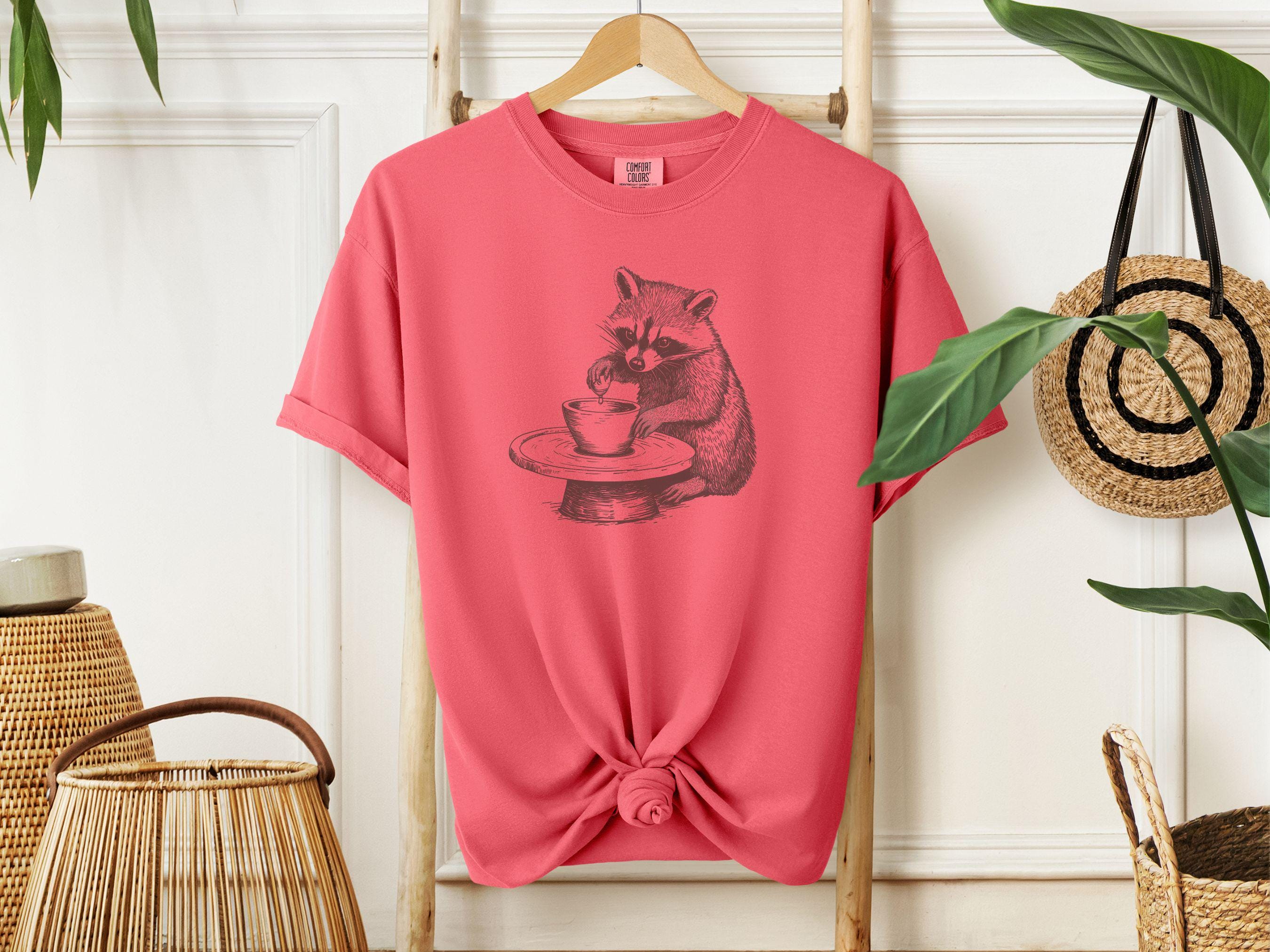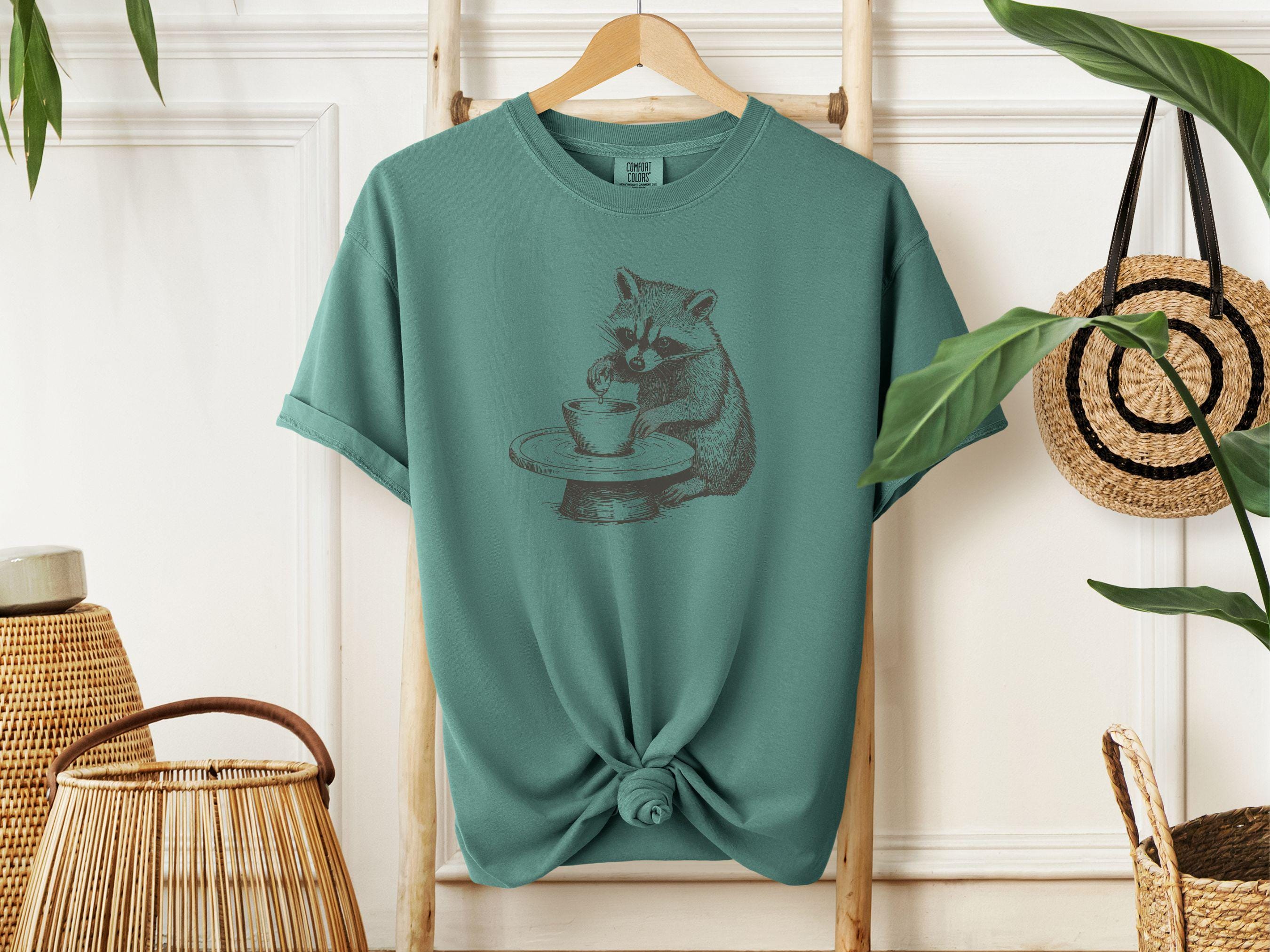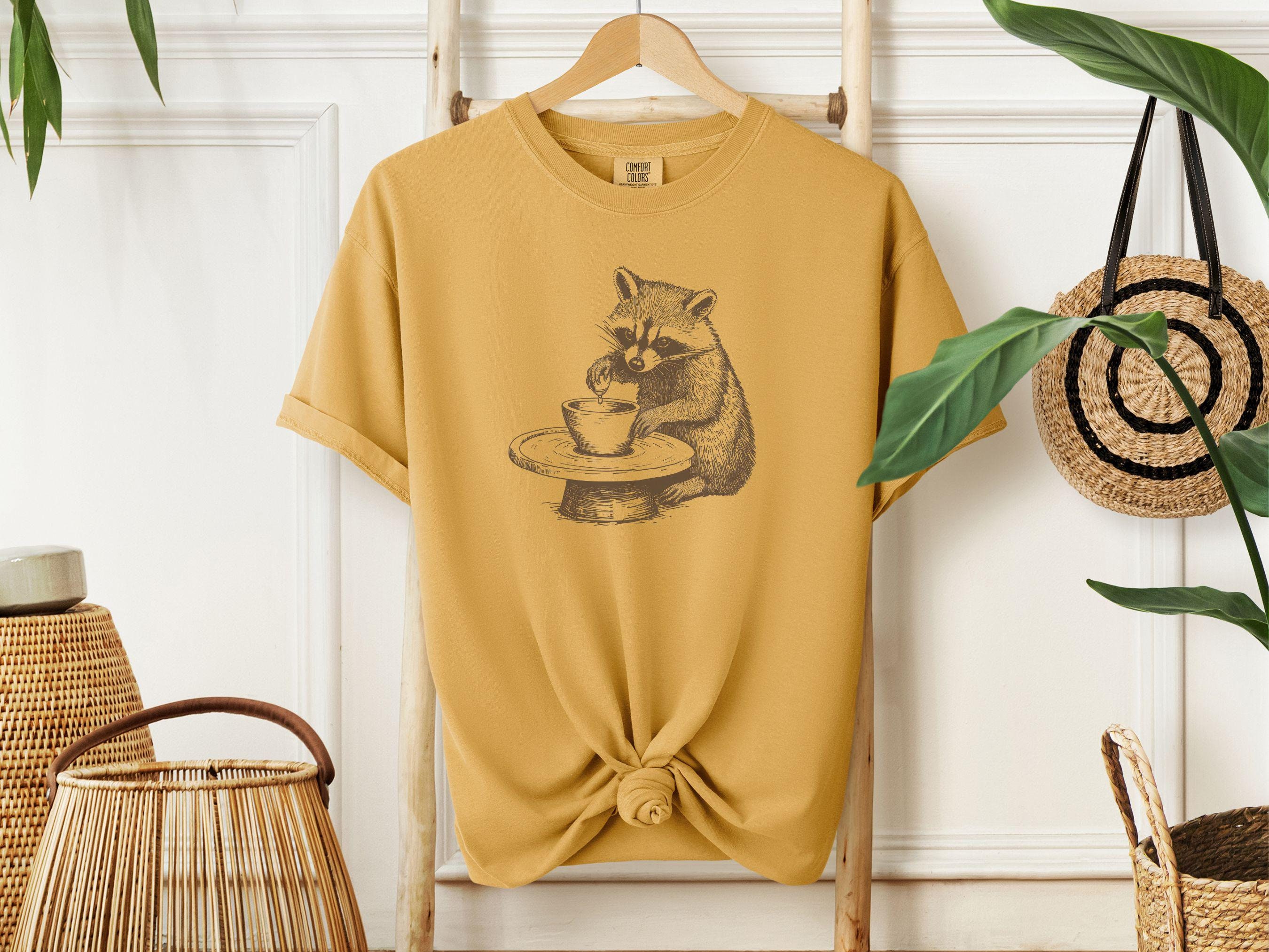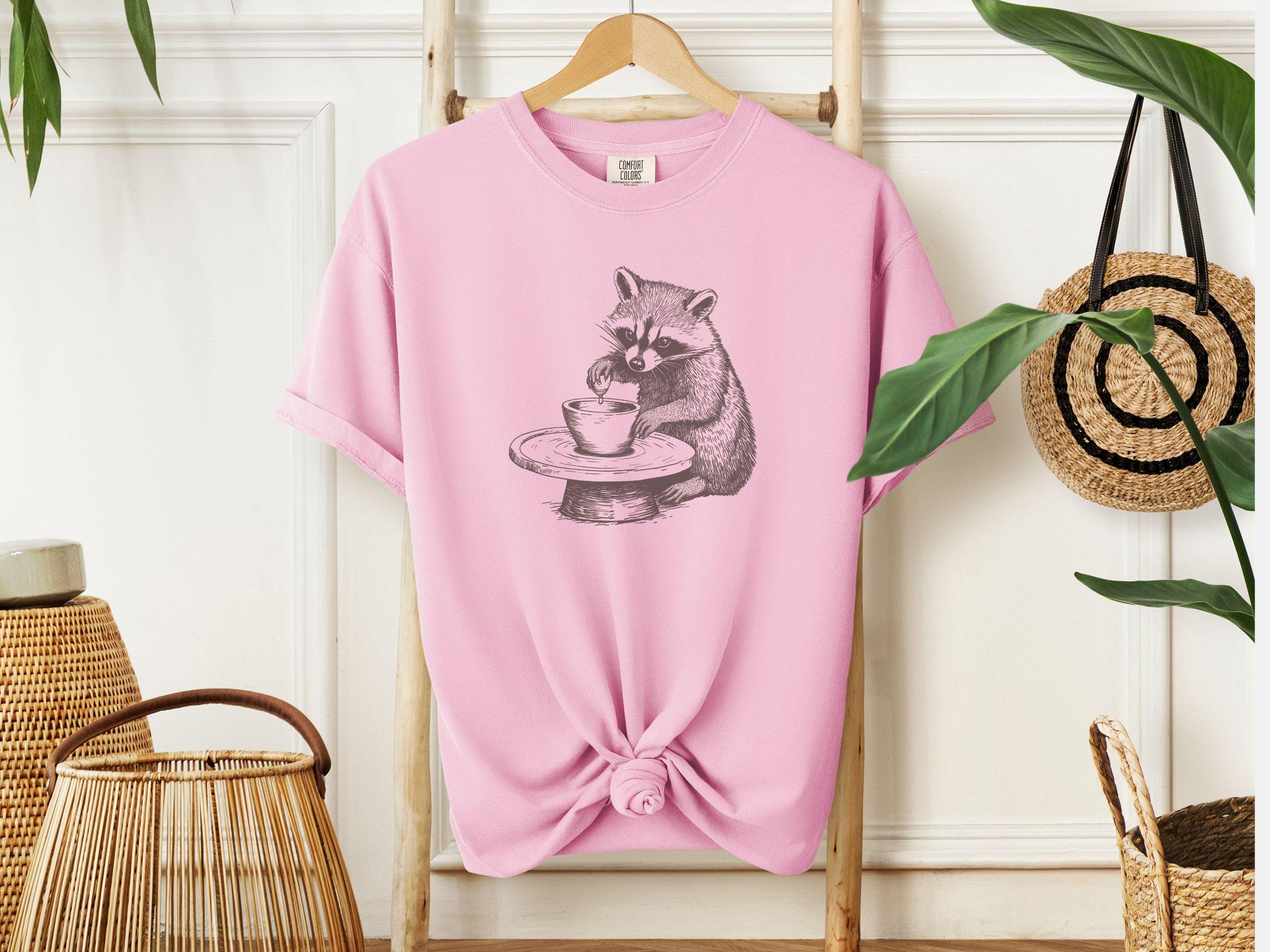 This charming t-shirt features a hand-drawn raccoon at a pottery wheel. It’s perfect for ceramic artists, pottery lovers, and anyone who appreciates whimsical designs. A relaxed fit makes it comfortable and cozy. A great gift for art enthusiasts.