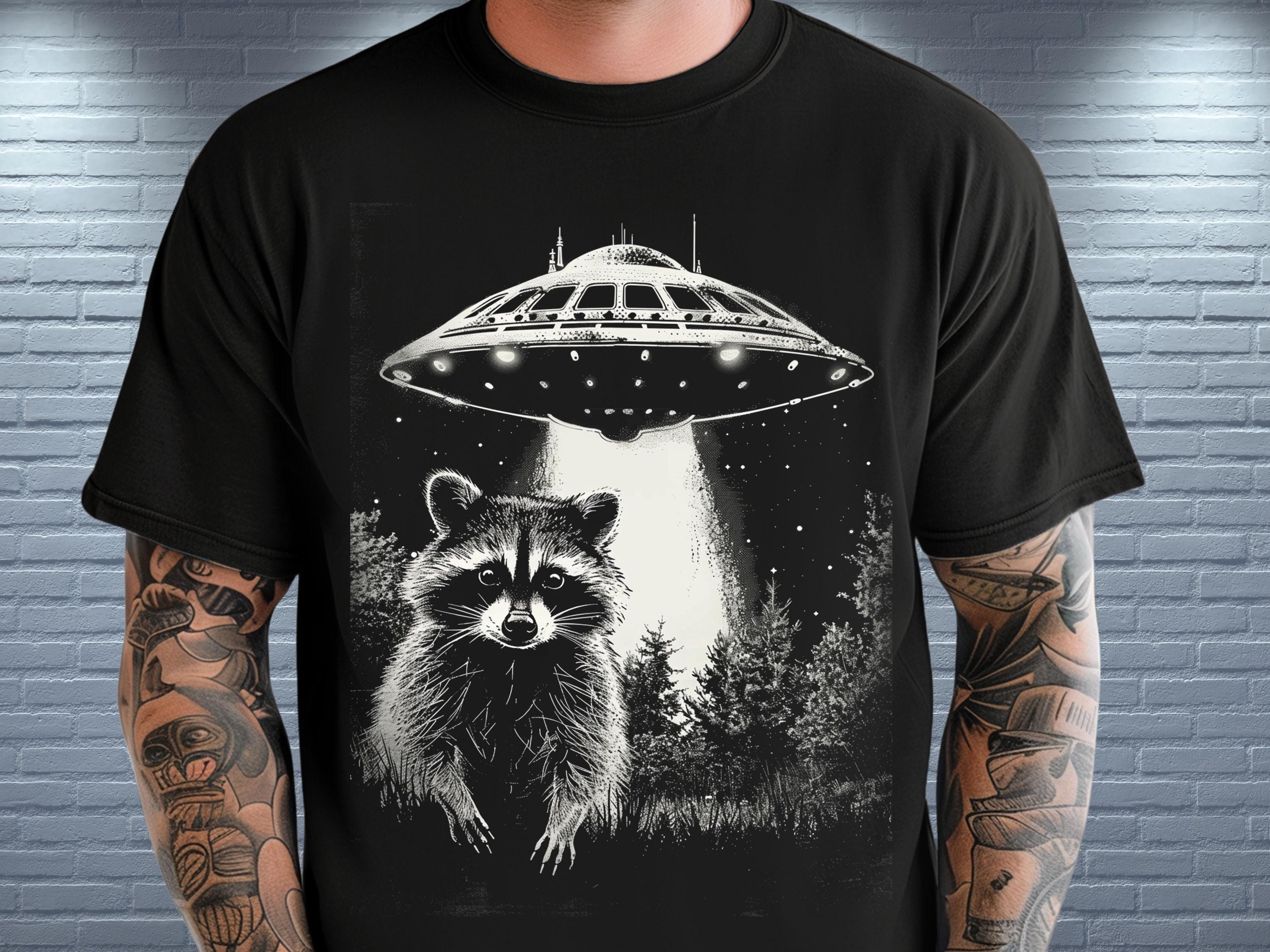 A comfortable, whimsical unisex t-shirt featuring a raccoon and UFO design. Perfect for casual wear or gifting. Available in sizes S-4XL. Durable and pre-shrunk for long-lasting wear.